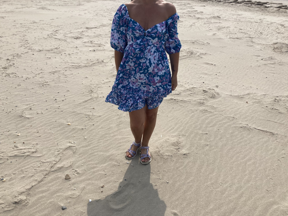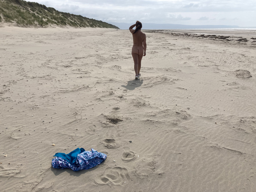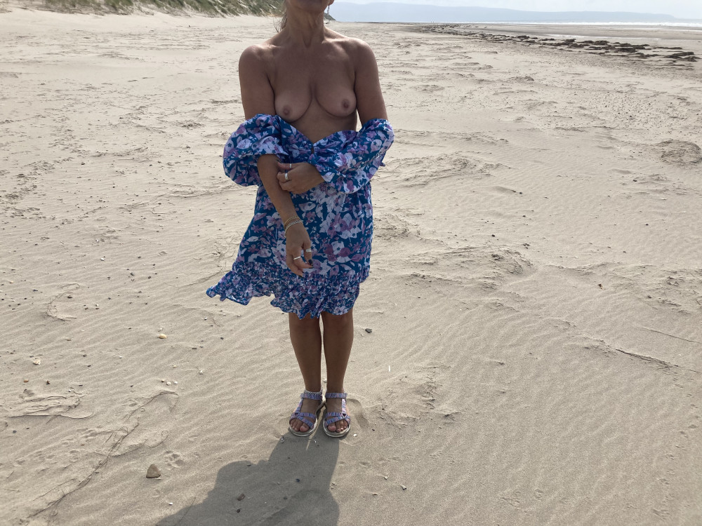 Had fun with my new French Connection summer dress. Started off flashing on a public beach, sometimes with the help of the breeze. Then stripped off on a quieter part of the beach.
